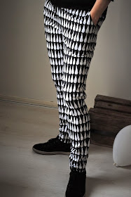 En ole sattuneesta syystä leggari-ihmisiä, vaikka toisaalta haluaisinkin. Raappahousut jäivät ensijärkytykseltä jalkaan pysyvästi, joten totesin kaavan muokkauksen olevan oikealla suunnalla. Olen haaveillut vaihtoehdosta, jossa alaosa olisi kuviollinen ja yläosa yksivärinen. Nämä pökät ovat nyt rennot ja sopivan väljät minun makuuni.